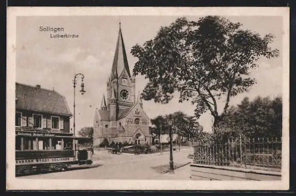 AK Solingen, Lutherkirche, Strassenbahn