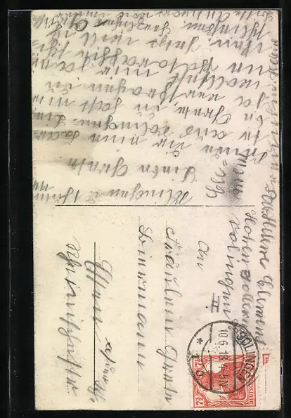 Personenbezogene Daten auf der Rückseite der Karte wurden durch blauen Textmarker unkenntlich gemacht. Die blauen Stellen sind auf die Vorderseite durchgeweicht und wirken sich negativ auf das Postkartenfoto aus