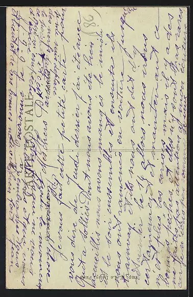 Personenbezogene Daten auf der Rückseite der Karte wurden durch blauen Textmarker unkenntlich gemacht. Die blauen Stellen sind auf die Vorderseite durchgeweicht und wirken sich negativ auf das Postkartenfoto aus