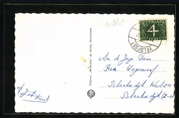 Personenbezogene Daten auf der Rückseite der Karte wurden durch blauen Textmarker unkenntlich gemacht. Die blauen Stellen sind auf die Vorderseite durchgeweicht und wirken sich negativ auf das Postkartenfoto aus