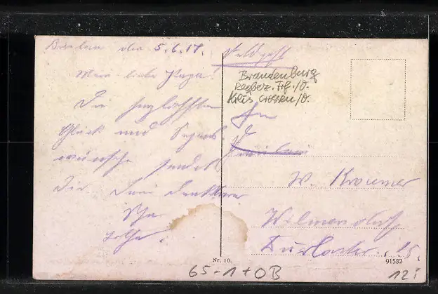 Personenbezogene Daten auf der Rückseite der Karte wurden durch blauen Textmarker unkenntlich gemacht. Die blauen Stellen sind auf die Vorderseite durchgeweicht und wirken sich negativ auf das Postkartenfoto aus