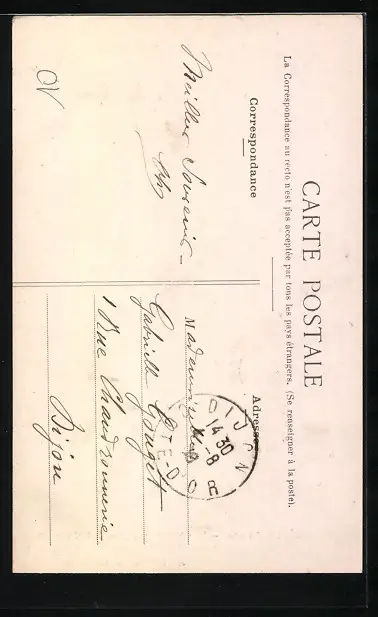Personenbezogene Daten auf der Rückseite der Karte wurden durch blauen Textmarker unkenntlich gemacht. Die blauen Stellen sind auf die Vorderseite durchgeweicht und wirken sich negativ auf das Postkartenfoto aus