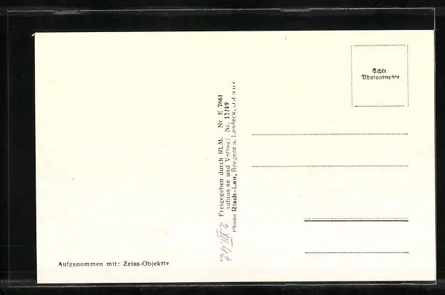 Personenbezogene Daten auf der Rückseite der Karte wurden durch blauen Textmarker unkenntlich gemacht. Die blauen Stellen sind auf die Vorderseite durchgeweicht und wirken sich negativ auf das Postkartenfoto aus