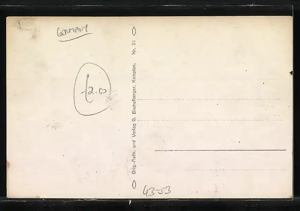 Personenbezogene Daten auf der Rückseite der Karte wurden durch blauen Textmarker unkenntlich gemacht. Die blauen Stellen sind auf die Vorderseite durchgeweicht und wirken sich negativ auf das Postkartenfoto aus