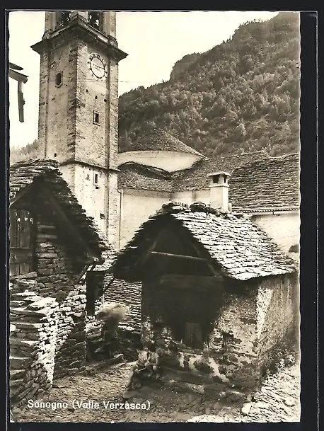 AK Sonogno /Valle Verzasca, Ortspartie am Kirchturm