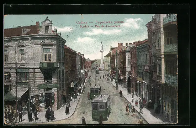 AK Sophia, Rue de Commerce, Strassenpartie mit Strassenbahn