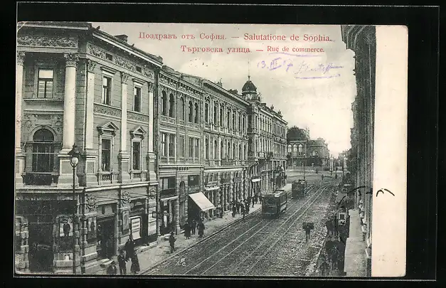 AK Sophia, Rue de commerce, Strassenbahn