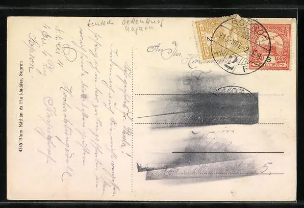 Personenbezogene Daten auf der Rückseite der Karte wurden durch blauen Textmarker unkenntlich gemacht. Die blauen Stellen sind auf die Vorderseite durchgeweicht und wirken sich negativ auf das Postkartenfoto aus