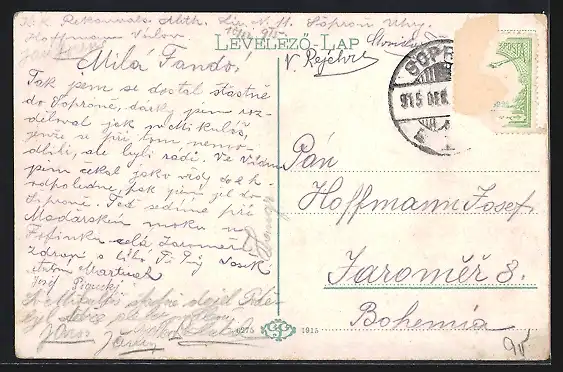gelaufen 1915, Briefmarke entfernt, rückseitig Oberflächenschaden, Ecken bestoßen, guter Zustand
