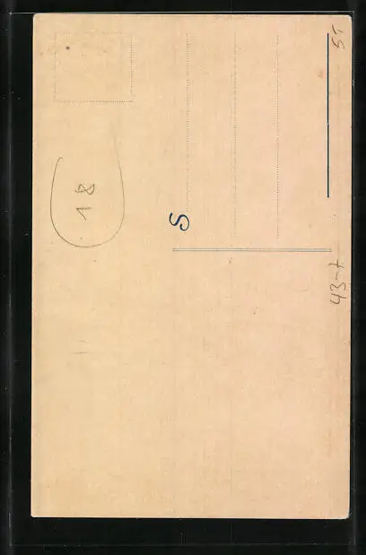 Personenbezogene Daten auf der Rückseite der Karte wurden durch blauen Textmarker unkenntlich gemacht. Die blauen Stellen sind auf die Vorderseite durchgeweicht und wirken sich negativ auf das Postkartenfoto aus
