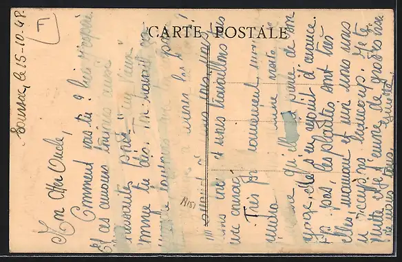 Personenbezogene Daten auf der Rückseite der Karte wurden durch blauen Textmarker unkenntlich gemacht. Die blauen Stellen sind auf die Vorderseite durchgeweicht und wirken sich negativ auf das Postkartenfoto aus