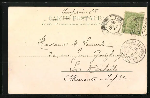 Personenbezogene Daten auf der Rückseite der Karte wurden durch blauen Textmarker unkenntlich gemacht. Die blauen Stellen sind auf die Vorderseite durchgeweicht und wirken sich negativ auf das Postkartenfoto aus