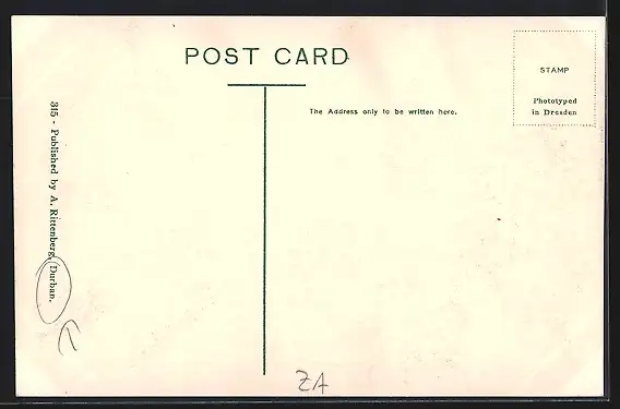 Personenbezogene Daten auf der Rückseite der Karte wurden durch blauen Textmarker unkenntlich gemacht. Die blauen Stellen sind auf die Vorderseite durchgeweicht und wirken sich negativ auf das Postkartenfoto aus