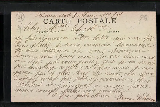 Personenbezogene Daten auf der Rückseite der Karte wurden durch blauen Textmarker unkenntlich gemacht. Die blauen Stellen sind auf die Vorderseite durchgeweicht und wirken sich negativ auf das Postkartenfoto aus