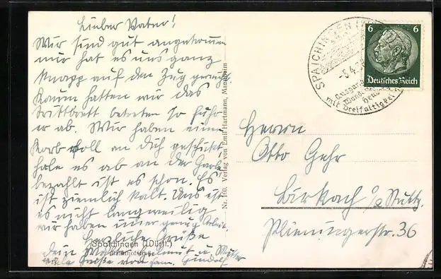 Personenbezogene Daten auf der Rückseite der Karte wurden durch blauen Textmarker unkenntlich gemacht. Die blauen Stellen sind auf die Vorderseite durchgeweicht und wirken sich negativ auf das Postkartenfoto aus