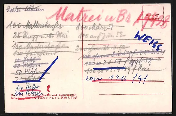 Personenbezogene Daten auf der Rückseite der Karte wurden durch blauen Textmarker unkenntlich gemacht. Die blauen Stellen sind auf die Vorderseite durchgeweicht und wirken sich negativ auf das Postkartenfoto aus