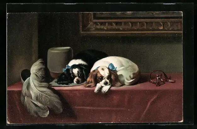 AK Spaniels aus König Karls Zucht neben einem Federhut