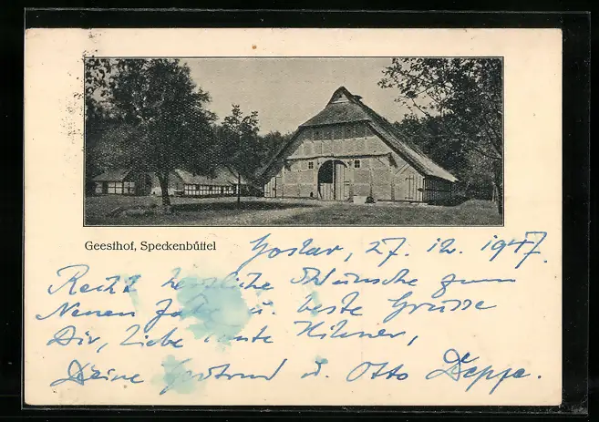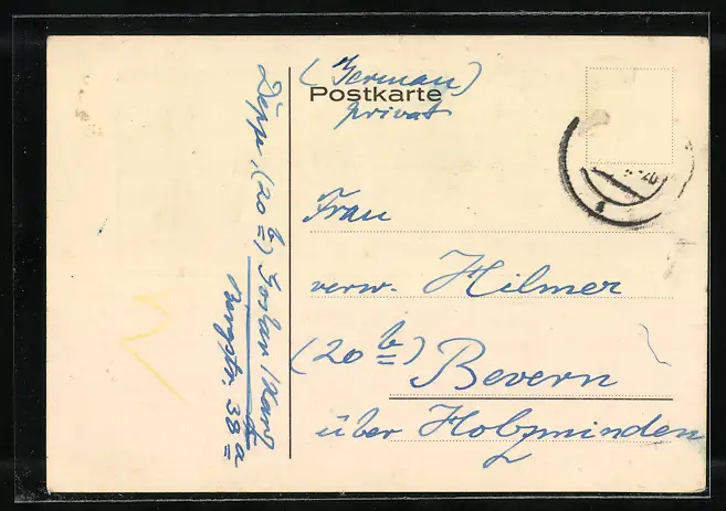Personenbezogene Daten auf der Rückseite der Karte wurden durch blauen Textmarker unkenntlich gemacht. Die blauen Stellen sind auf die Vorderseite durchgeweicht und wirken sich negativ auf das Postkartenfoto aus