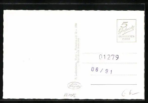 Personenbezogene Daten auf der Rückseite der Karte wurden durch blauen Textmarker unkenntlich gemacht. Die blauen Stellen sind auf die Vorderseite durchgeweicht und wirken sich negativ auf das Postkartenfoto aus