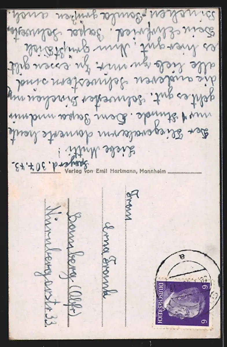 Personenbezogene Daten auf der Rückseite der Karte wurden durch blauen Textmarker unkenntlich gemacht. Die blauen Stellen sind auf die Vorderseite durchgeweicht und wirken sich negativ auf das Postkartenfoto aus