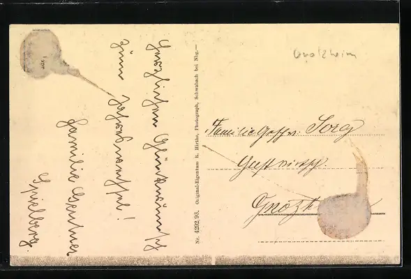Personenbezogene Daten auf der Rückseite der Karte wurden durch blauen Textmarker unkenntlich gemacht. Die blauen Stellen sind auf die Vorderseite durchgeweicht und wirken sich negativ auf das Postkartenfoto aus