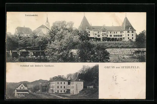 AK Spielfeld, Totalansicht, Bahnhof mit Stelzers Gasthaus