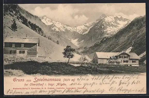AK Spielmannsau, Ortsansicht mit Gebirgspanorama