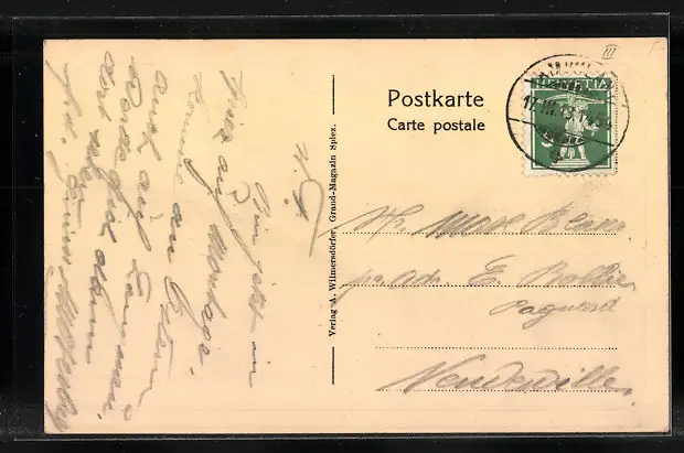 Personenbezogene Daten auf der Rückseite der Karte wurden durch blauen Textmarker unkenntlich gemacht. Die blauen Stellen sind auf die Vorderseite durchgeweicht und wirken sich negativ auf das Postkartenfoto aus
