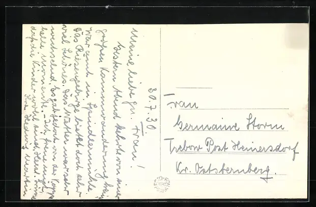 Personenbezogene Daten auf der Rückseite der Karte wurden durch blauen Textmarker unkenntlich gemacht. Die blauen Stellen sind auf die Vorderseite durchgeweicht und wirken sich negativ auf das Postkartenfoto aus