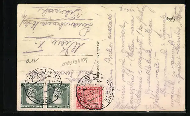 Personenbezogene Daten auf der Rückseite der Karte wurden durch blauen Textmarker unkenntlich gemacht. Die blauen Stellen sind auf die Vorderseite durchgeweicht und wirken sich negativ auf das Postkartenfoto aus