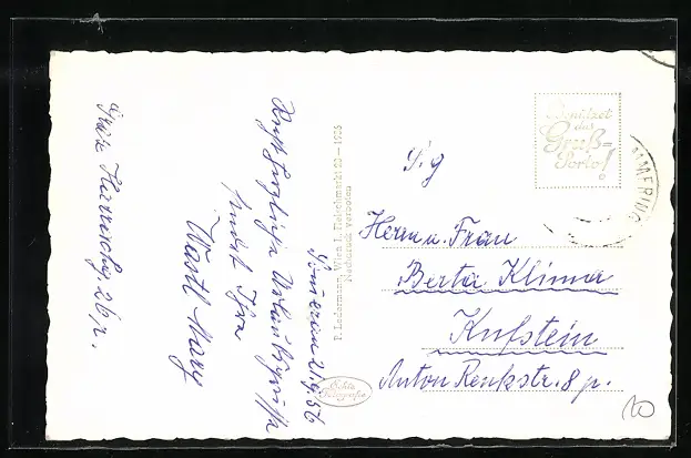 Personenbezogene Daten auf der Rückseite der Karte wurden durch blauen Textmarker unkenntlich gemacht. Die blauen Stellen sind auf die Vorderseite durchgeweicht und wirken sich negativ auf das Postkartenfoto aus
