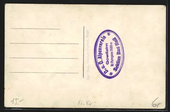Personenbezogene Daten auf der Rückseite der Karte wurden durch blauen Textmarker unkenntlich gemacht. Die blauen Stellen sind auf die Vorderseite durchgeweicht und wirken sich negativ auf das Postkartenfoto aus