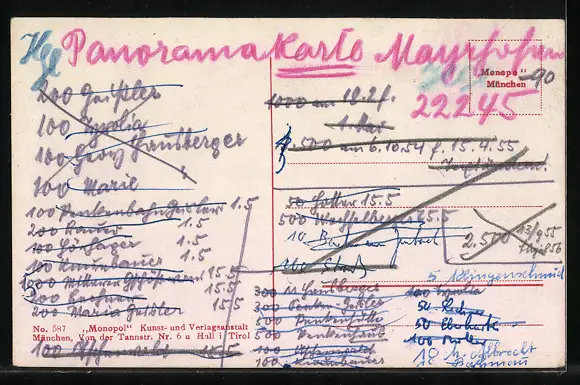 Personenbezogene Daten auf der Rückseite der Karte wurden durch blauen Textmarker unkenntlich gemacht. Die blauen Stellen sind auf die Vorderseite durchgeweicht und wirken sich negativ auf das Postkartenfoto aus