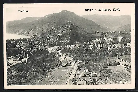 AK Spitz /Donau, Ortsansicht mit Donau aus der Vogelschau