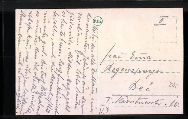 Personenbezogene Daten auf der Rückseite der Karte wurden durch blauen Textmarker unkenntlich gemacht. Die blauen Stellen sind auf die Vorderseite durchgeweicht und wirken sich negativ auf das Postkartenfoto aus