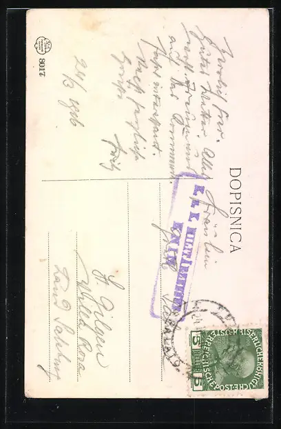 Personenbezogene Daten auf der Rückseite der Karte wurden durch blauen Textmarker unkenntlich gemacht. Die blauen Stellen sind auf die Vorderseite durchgeweicht und wirken sich negativ auf das Postkartenfoto aus