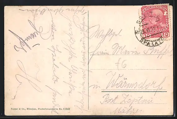 Personenbezogene Daten auf der Rückseite der Karte wurden durch blauen Textmarker unkenntlich gemacht. Die blauen Stellen sind auf die Vorderseite durchgeweicht und wirken sich negativ auf das Postkartenfoto aus