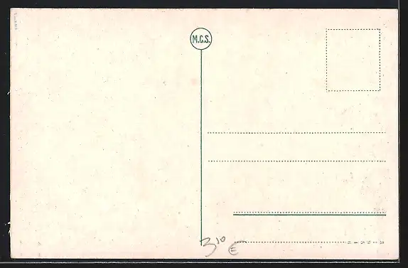 Personenbezogene Daten auf der Rückseite der Karte wurden durch blauen Textmarker unkenntlich gemacht. Die blauen Stellen sind auf die Vorderseite durchgeweicht und wirken sich negativ auf das Postkartenfoto aus