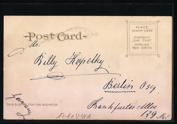Personenbezogene Daten auf der Rückseite der Karte wurden durch blauen Textmarker unkenntlich gemacht. Die blauen Stellen sind auf die Vorderseite durchgeweicht und wirken sich negativ auf das Postkartenfoto aus