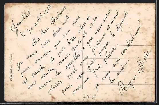 Personenbezogene Daten auf der Rückseite der Karte wurden durch blauen Textmarker unkenntlich gemacht. Die blauen Stellen sind auf die Vorderseite durchgeweicht und wirken sich negativ auf das Postkartenfoto aus