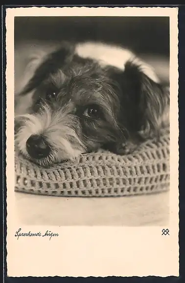 AK Sprechende Augen, Terrier auf einem Kissen