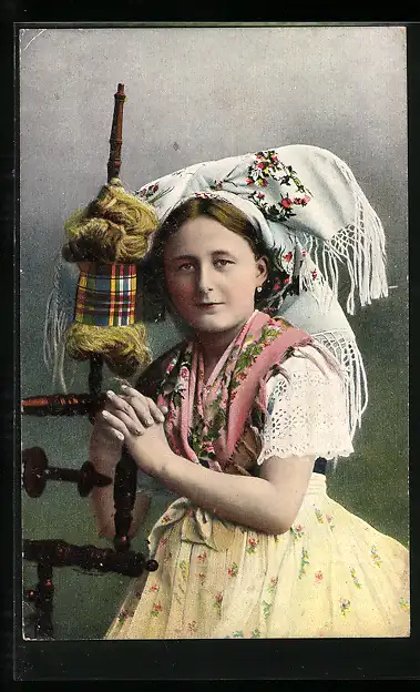 AK Spreewälderin sitzt am Spinnrad