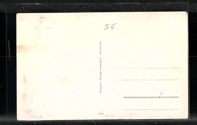 Personenbezogene Daten auf der Rückseite der Karte wurden durch blauen Textmarker unkenntlich gemacht. Die blauen Stellen sind auf die Vorderseite durchgeweicht und wirken sich negativ auf das Postkartenfoto aus