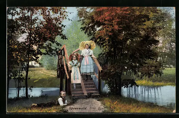 AK Spreewald, Eine Bank, Frauen und Junge in Tracht
