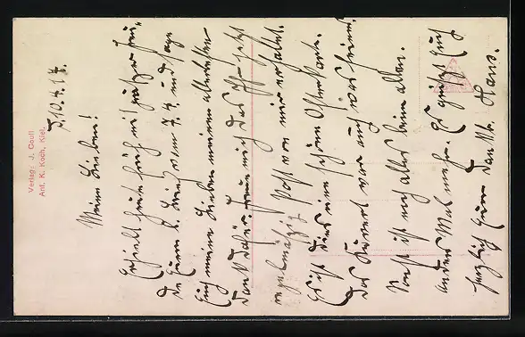 Personenbezogene Daten auf der Rückseite der Karte wurden durch blauen Textmarker unkenntlich gemacht. Die blauen Stellen sind auf die Vorderseite durchgeweicht und wirken sich negativ auf das Postkartenfoto aus