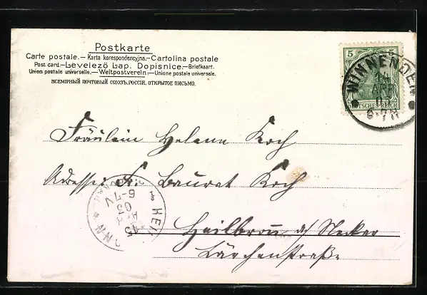 Personenbezogene Daten auf der Rückseite der Karte wurden durch blauen Textmarker unkenntlich gemacht. Die blauen Stellen sind auf die Vorderseite durchgeweicht und wirken sich negativ auf das Postkartenfoto aus