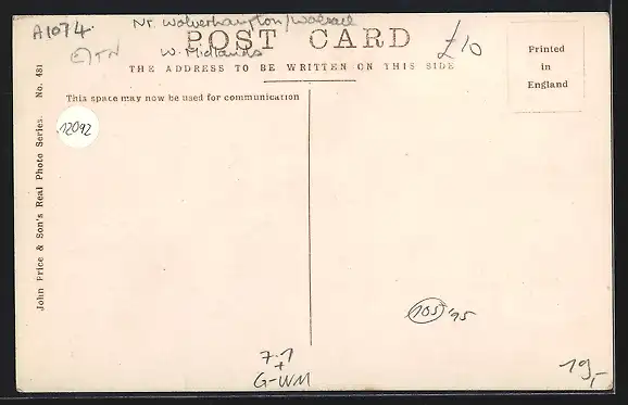 Personenbezogene Daten auf der Rückseite der Karte wurden durch blauen Textmarker unkenntlich gemacht. Die blauen Stellen sind auf die Vorderseite durchgeweicht und wirken sich negativ auf das Postkartenfoto aus