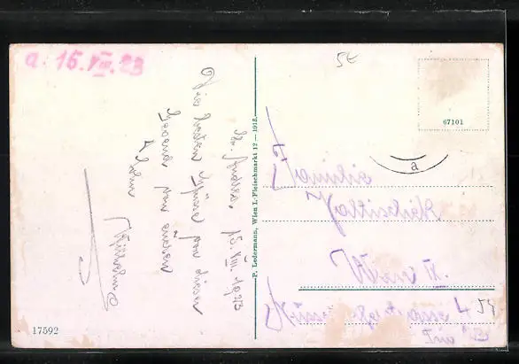 Personenbezogene Daten auf der Rückseite der Karte wurden durch blauen Textmarker unkenntlich gemacht. Die blauen Stellen sind auf die Vorderseite durchgeweicht und wirken sich negativ auf das Postkartenfoto aus