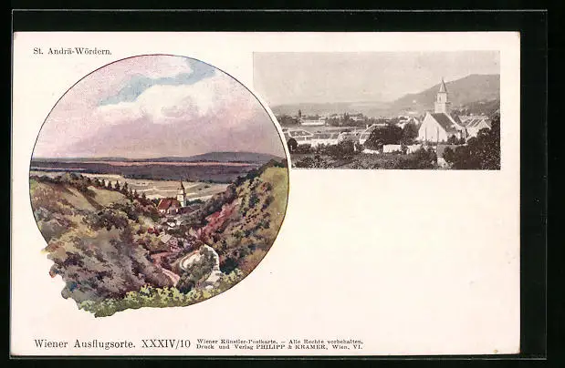 AK St. Andrä-Wördern, Ortsansicht mit Kirche in Abendstimmung