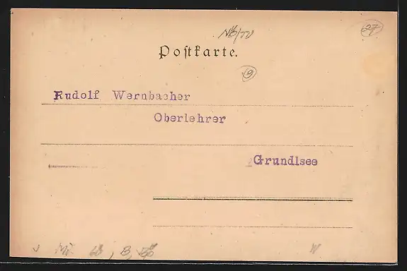 Personenbezogene Daten auf der Rückseite der Karte wurden durch blauen Textmarker unkenntlich gemacht. Die blauen Stellen sind auf die Vorderseite durchgeweicht und wirken sich negativ auf das Postkartenfoto aus